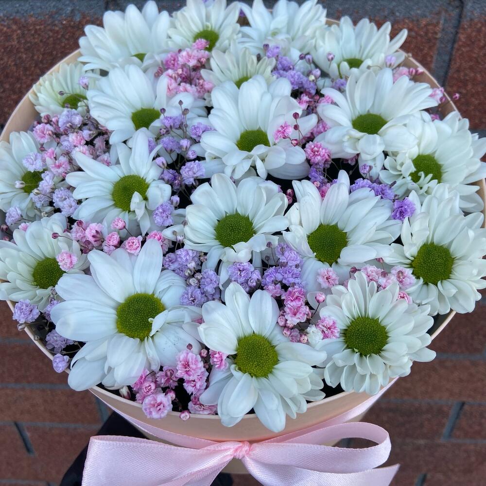 Гипсофила - 4 шт. Коробка шляпная - 1 шт. Ромашковая хризантема - 5 шт. Губка флористическая - 2 шт.