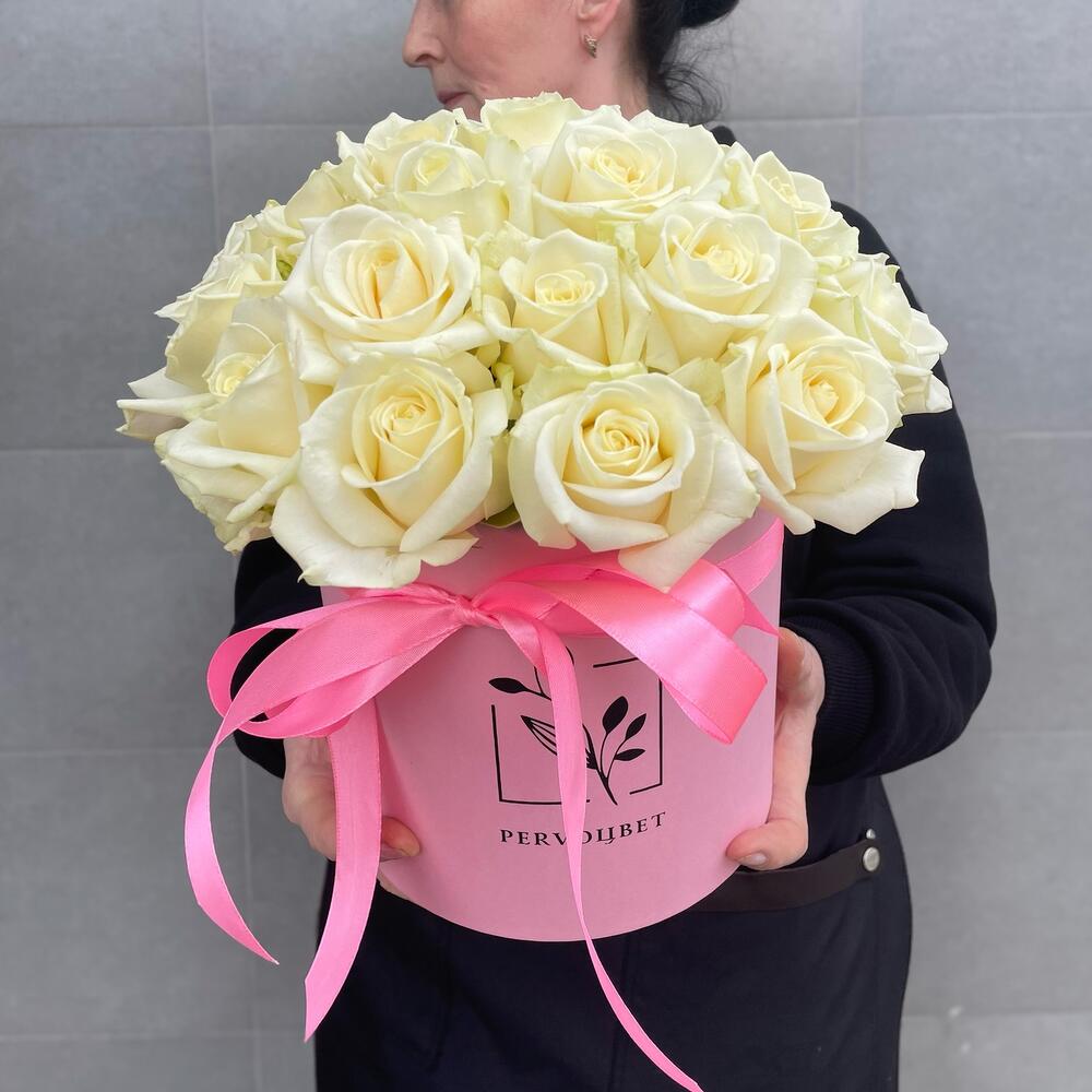 Композиция в шляпной коробке "Романтика" из белых одноголовых роз в Каменске-Шахтинском